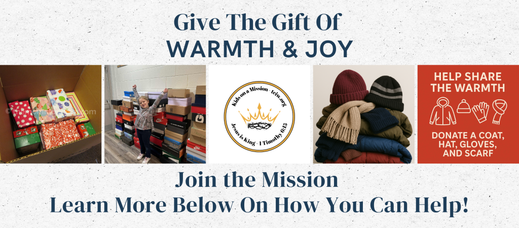 When the temperature drops, many families in our community struggle to stay warm. This year, Kids on a Mission are collecting new or gently used coats, hats, scarves, and gloves for children and adults. Every donation helps provide comfort, warmth, and a reminder of God’s love.