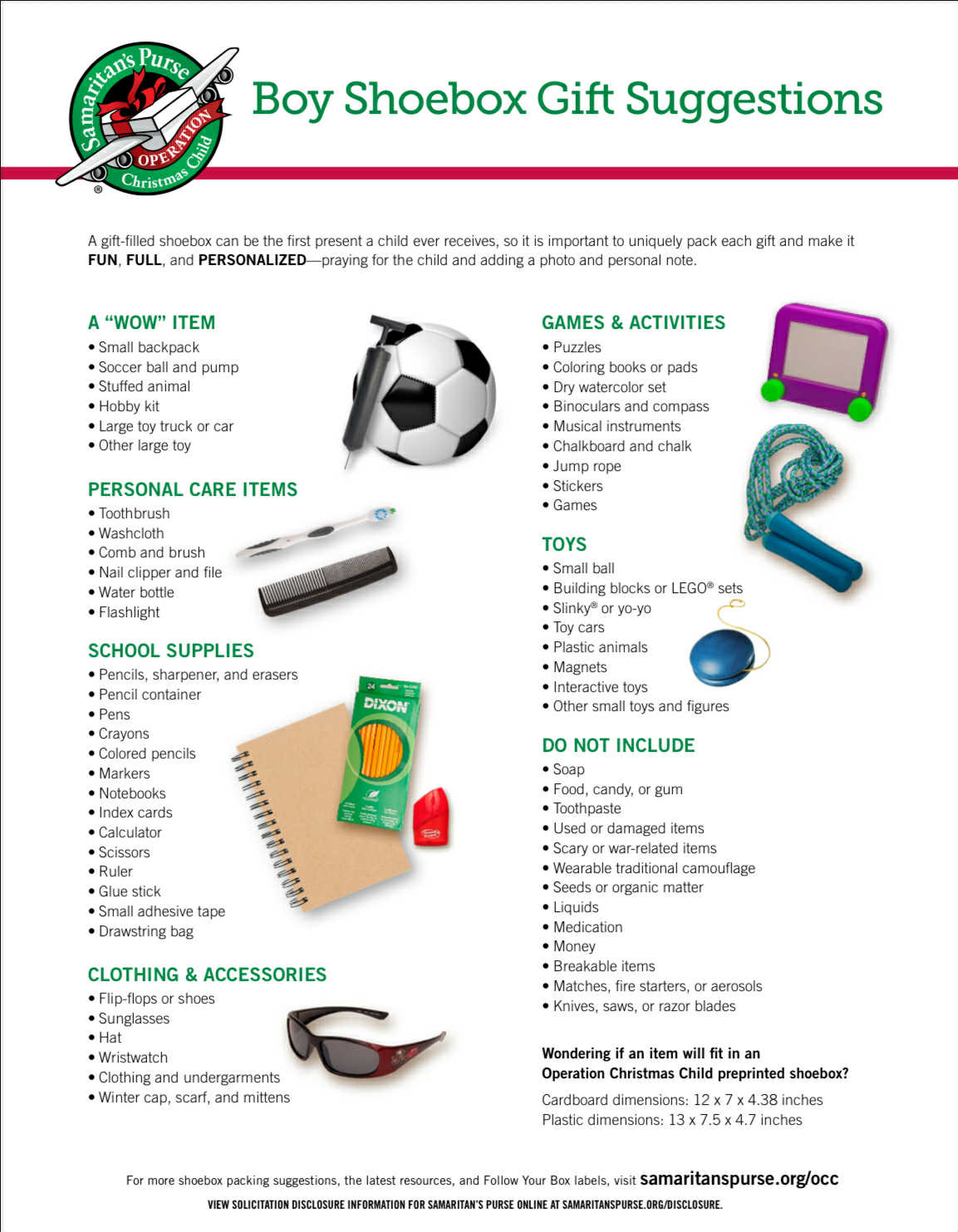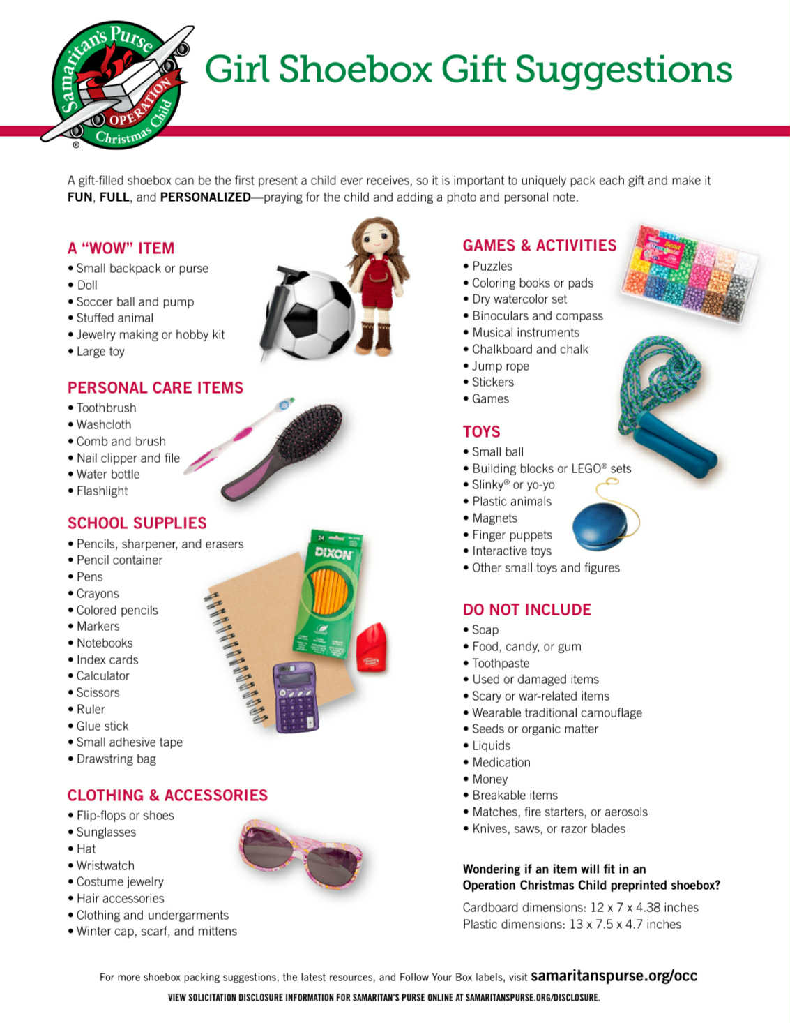 Christmas Shoeboxes: Partner with us and Samaritan’s Purse to fill Operation Christmas Child shoeboxes with gifts and the Gospel for children across the globe.